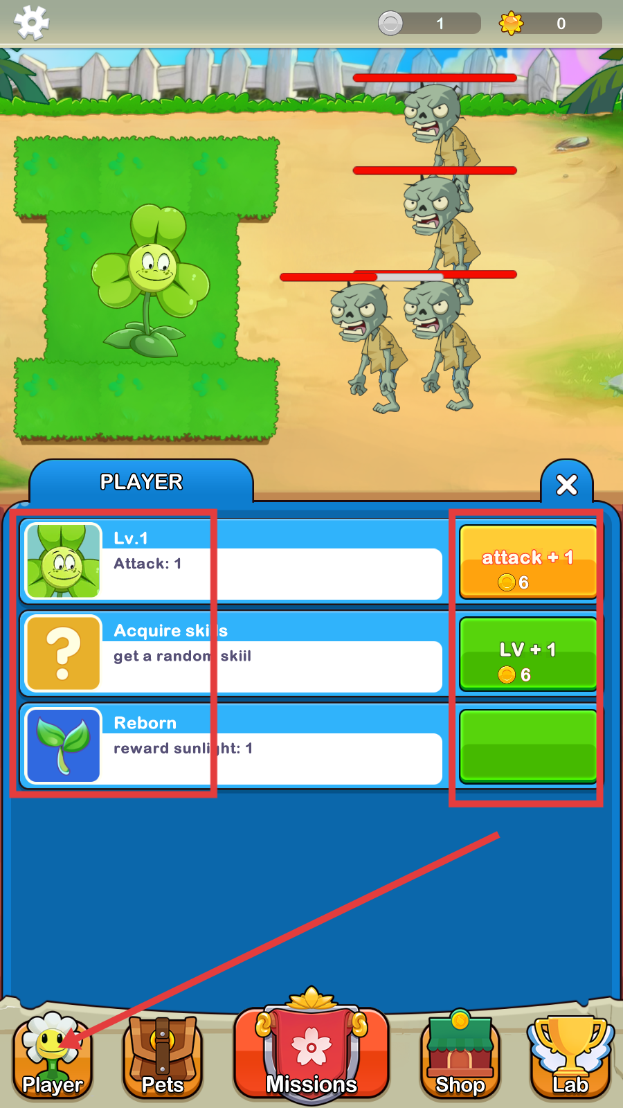 3、在【PLAYER】界面,花费金币点【attack+1】提升攻击力,或用【LV+1】升级,增强角色实力。