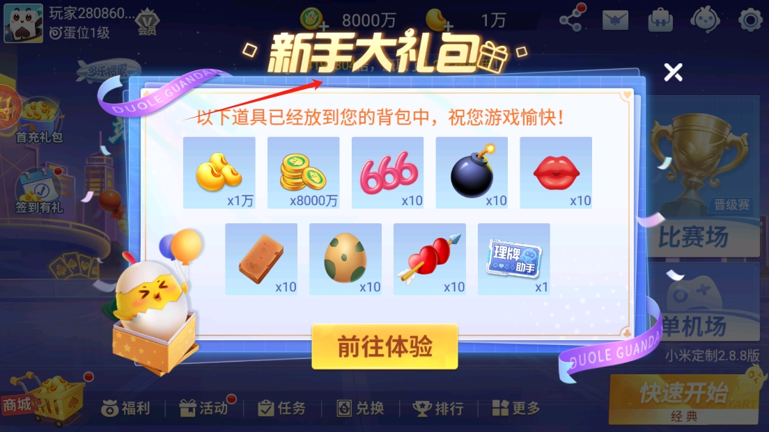 1、进入游戏后,点击“新手大礼包”按钮,领取游戏提供的初始道具。这些道具将帮助快速开始游戏,增加游戏乐趣。