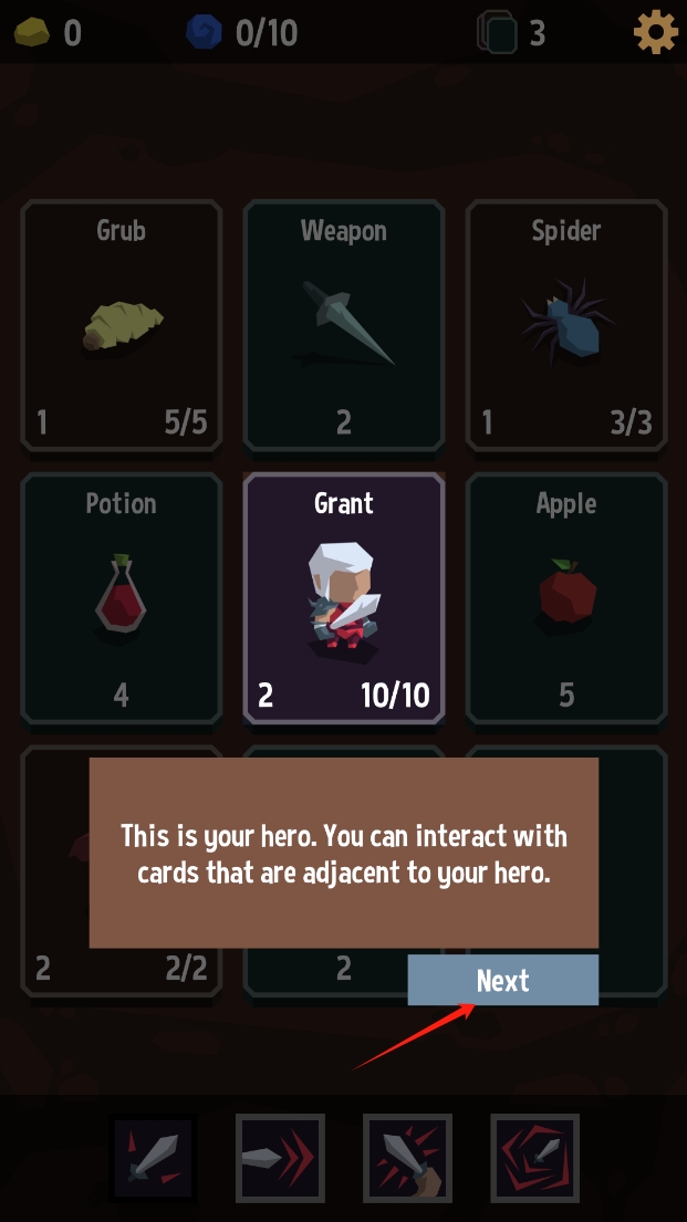 1、在游戏界面中,查看不同卡牌的功能和数量。点击“Next”按钮继续,了解如何与相邻卡牌互动。