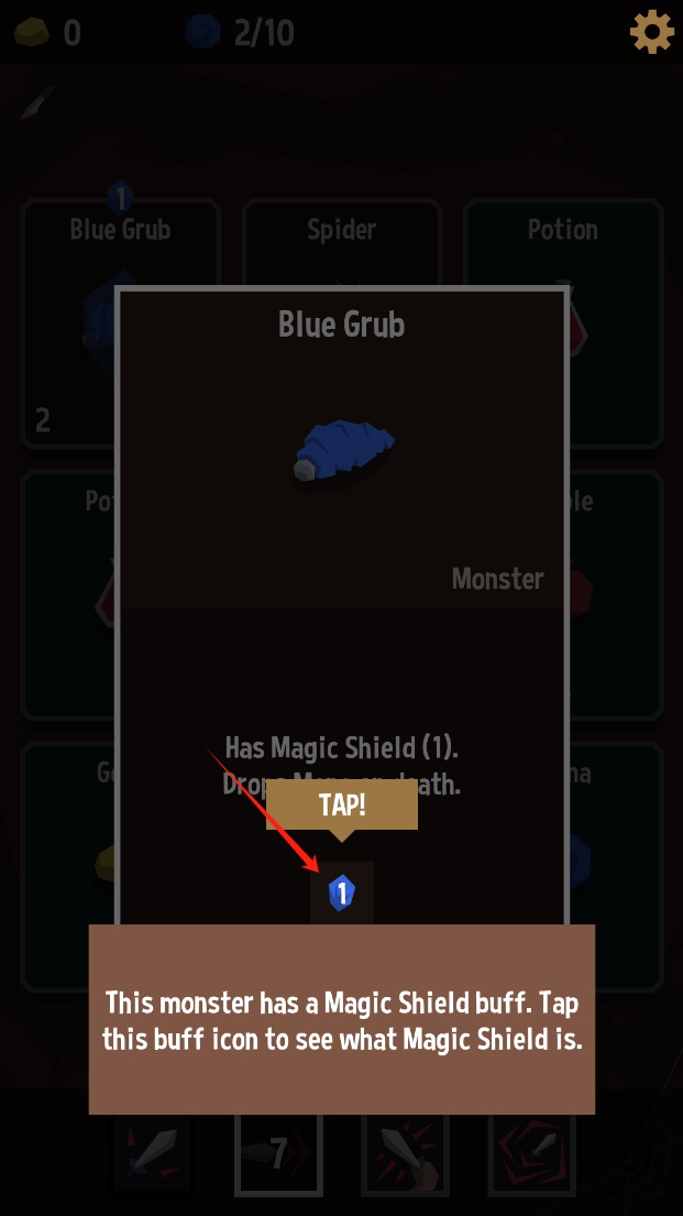 2、点击任意卡牌查看详细信息。例如,点击“Blue Grub”了解其魔法护盾效果,点击“TAP!”按钮获取更多信息。