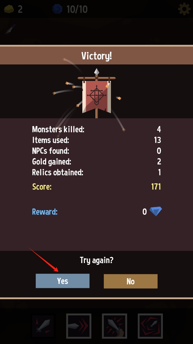 3、战斗胜利后,查看统计数据。点击“Yes”按钮再次挑战,或点击“No”按钮结束游戏,根据奖励情况选择下一步行动。