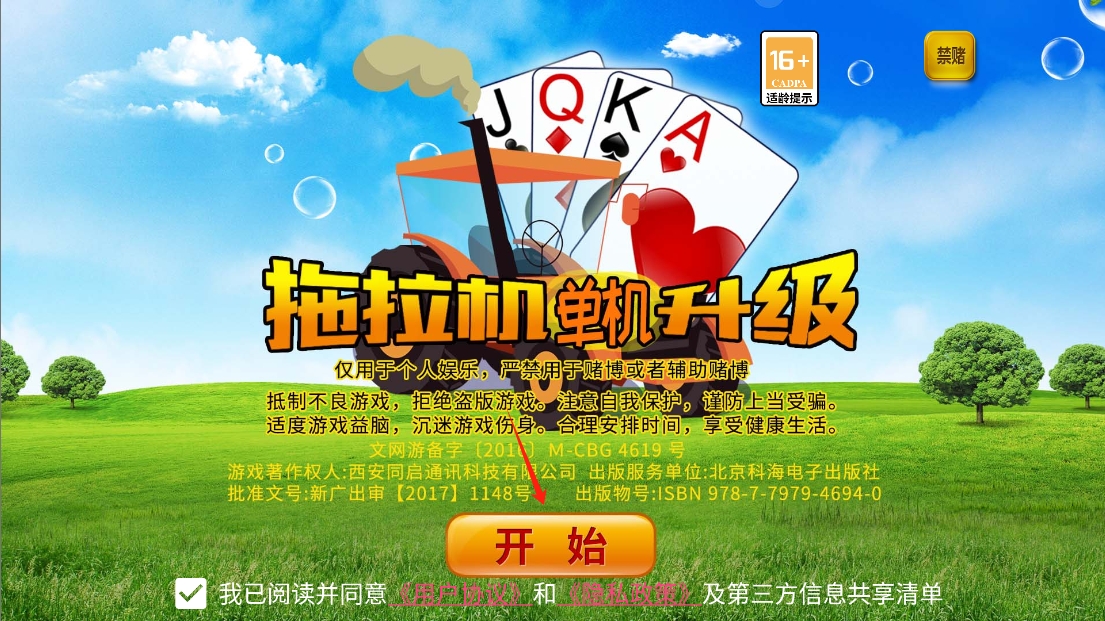 1、在游戏主界面,点击“开始”按钮进入游戏。阅读并同意相关协议,确保合规进入游戏环境。