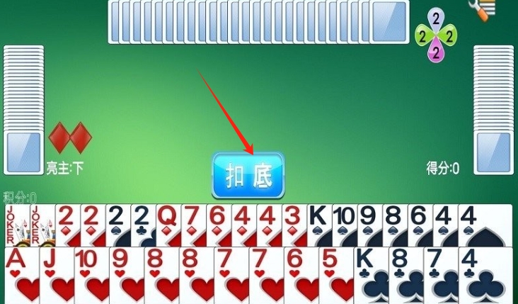 3、在游戏界面,点击“扣底”按钮参与游戏。根据手中的牌进行合理操作,争取获得更高的分数。