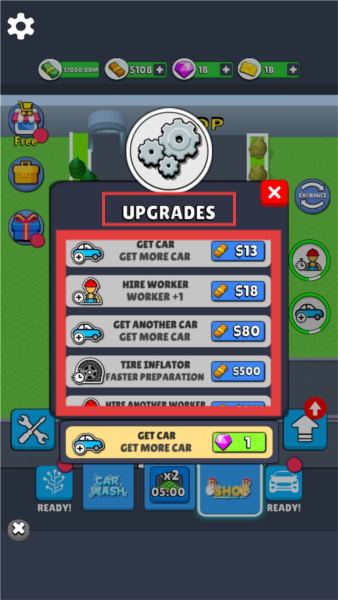 3、利用【UPGRADES】界面,按需花费对应金额进行如【GETCAR】【HIREWORKER】等项目升级,提升游戏运营效率。