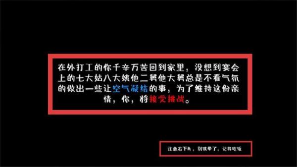 1、了解游戏背景,玩家需扮演在外打工回家的角色,应对宴会上亲戚们引发的尴尬状况,目标是【维持这份亲情】,接受相关挑战。