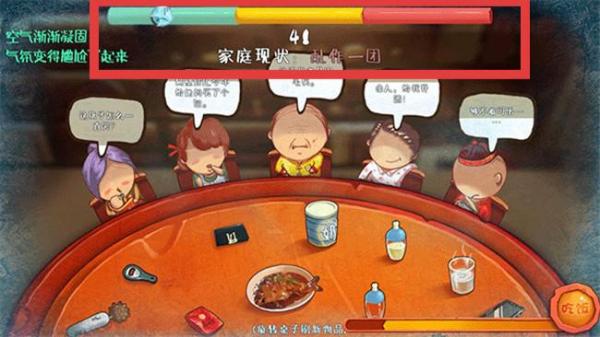 2、关注游戏界面上方的【家庭现状】进度条和氛围提示,根据亲戚们的言论,采取合适策略,避免氛围过度尴尬,维持家庭聚会和谐。