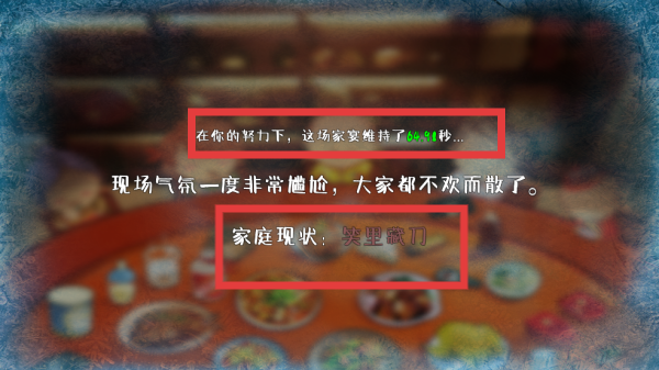 3、游戏结束后,留意显示的结果信息,如【这场家宴维持了6分41秒】和【家庭现状:笑里藏刀】,总结经验,改进后续游戏表现。