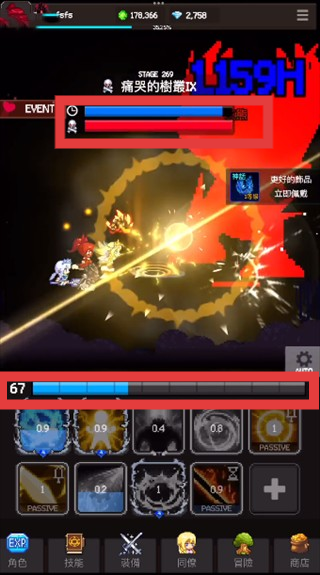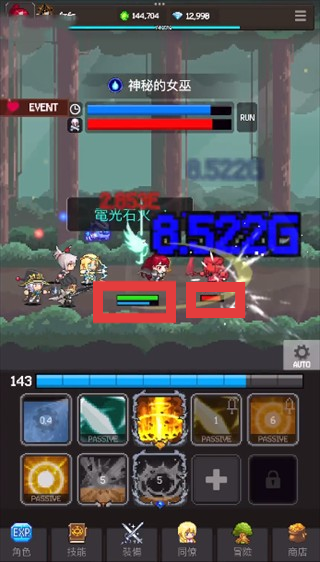 1、战斗中关注怪物血条,如【神秘的女巫】血条,根据剩余血量合理安排技能释放,同时留意角色血条,确保生存。