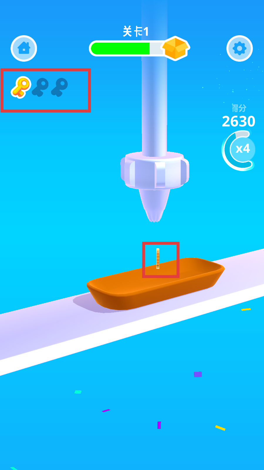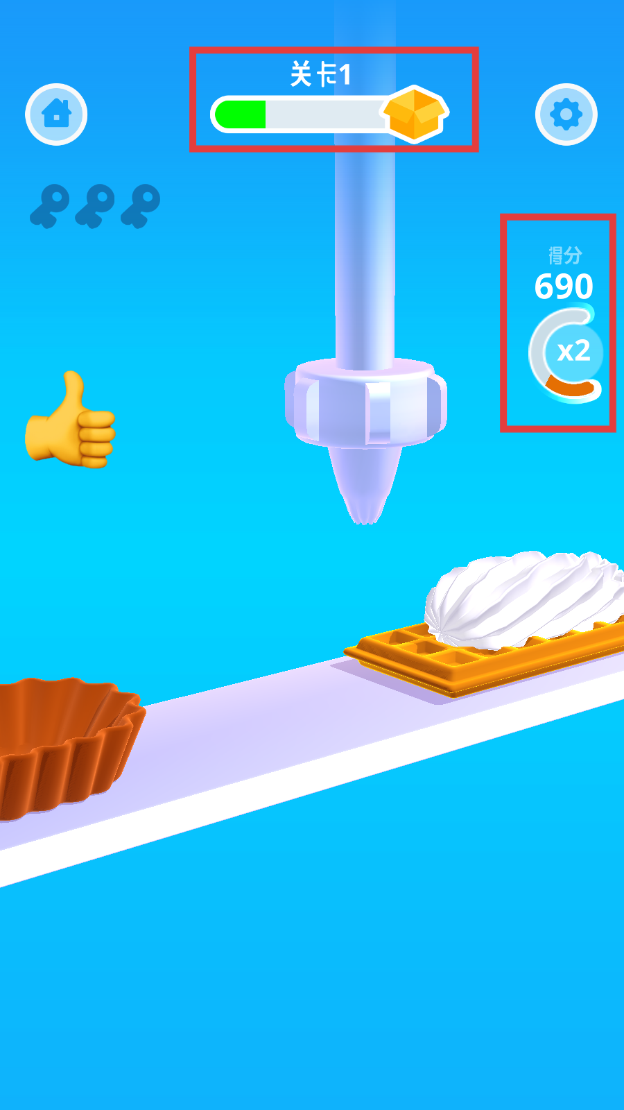 2、注意界面上的钥匙标识,尽可能获取金色钥匙,可能用于解锁奖励或开启新关卡,同时留意食物上的进度条,精准操作。