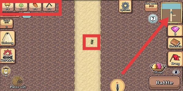 3、进入游戏后,关注界面上方和侧边栏功能按钮,如食物、工具等图标,利用这些功能管理蚁群,点击右侧放大镜图标可查看蚂蚁状态等。