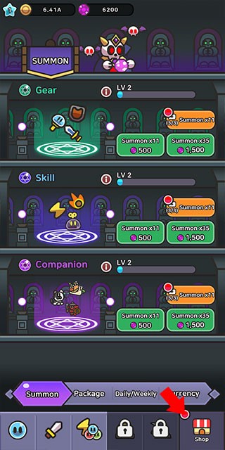 3、进入【SUMMON】界面,可通过消耗对应资源进行操作,获取【Gear】【Skill】等,丰富角色装备和技能体系,提升战斗能力。