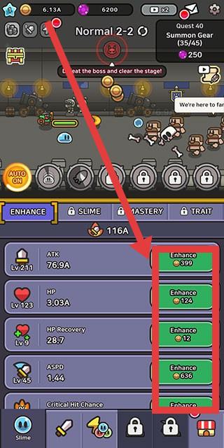 1、在【ENHANCE】界面,根据资源情况点击对应属性旁的【Enhance】按钮,如【ATK】【HP】等,消耗金币提升属性等级,增强角色实力。