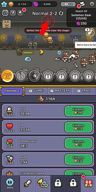 2、关注关卡提示【Normal2-2】及目标【Defeatthebossandclearthestage!】,合理分配资源提升属性,为通关关卡做准备。