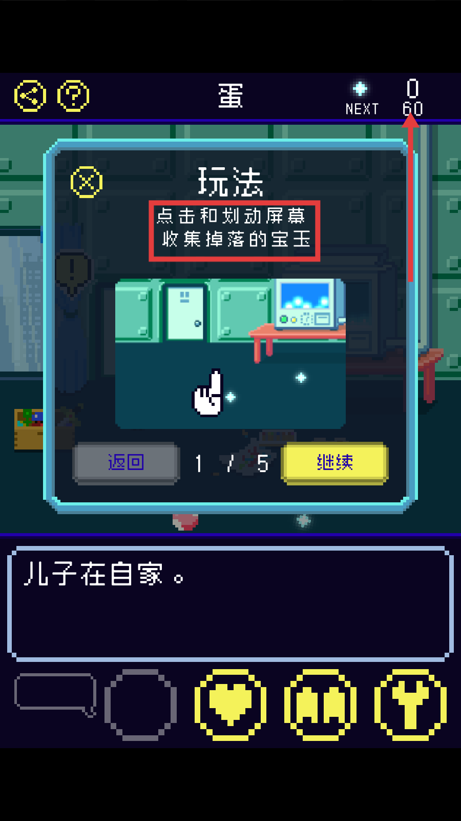 1、按照游戏提示,通过【点击和划动屏幕收集掉落的宝玉】,积累宝玉数量,留意右上角【NEXT60】,可能是进化所需宝玉数量或倒计时。