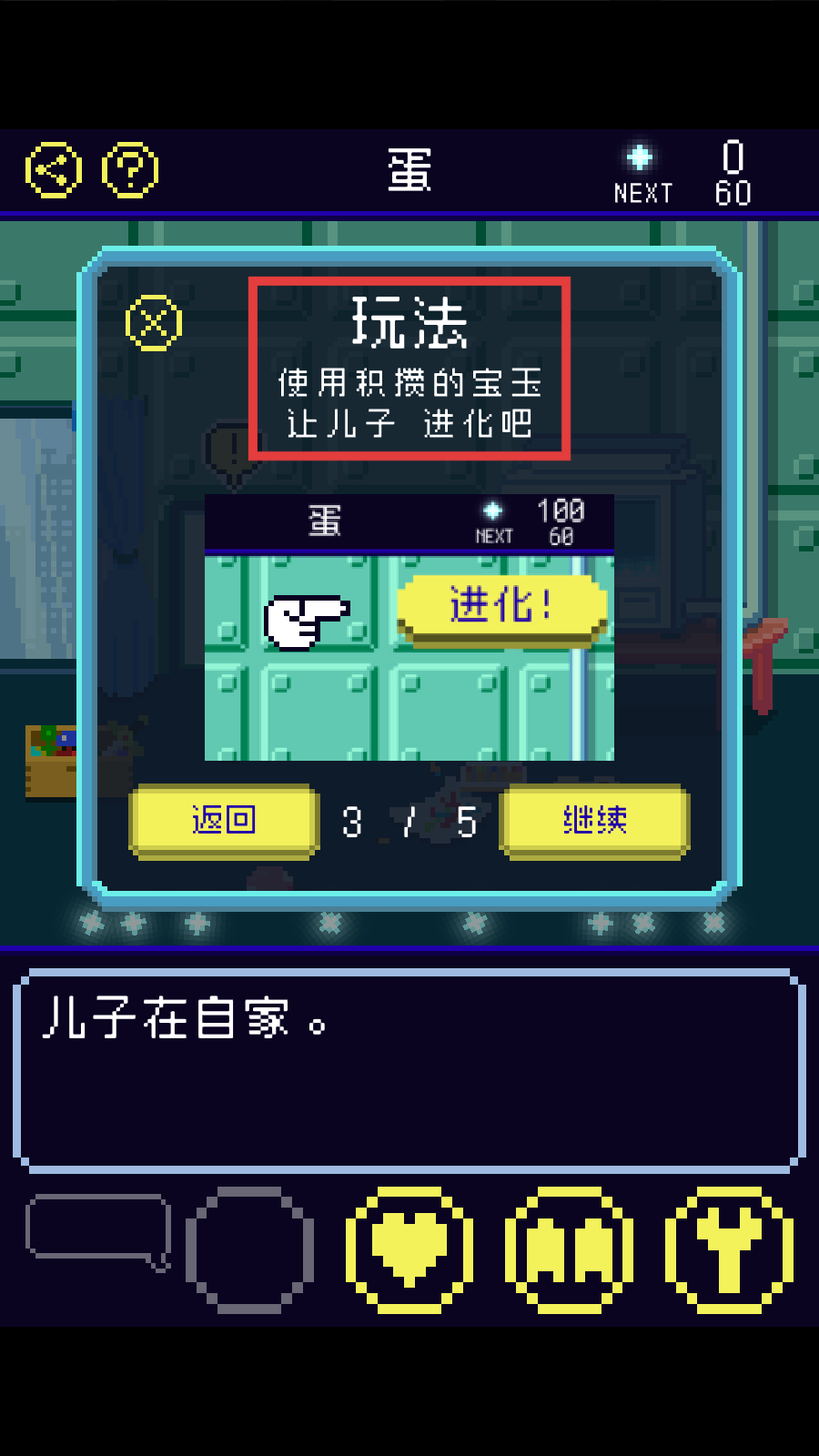 2、当积累足够宝玉后,使用宝玉让“儿子”进化,点击【进化】按钮完成进化操作,推动游戏进程。