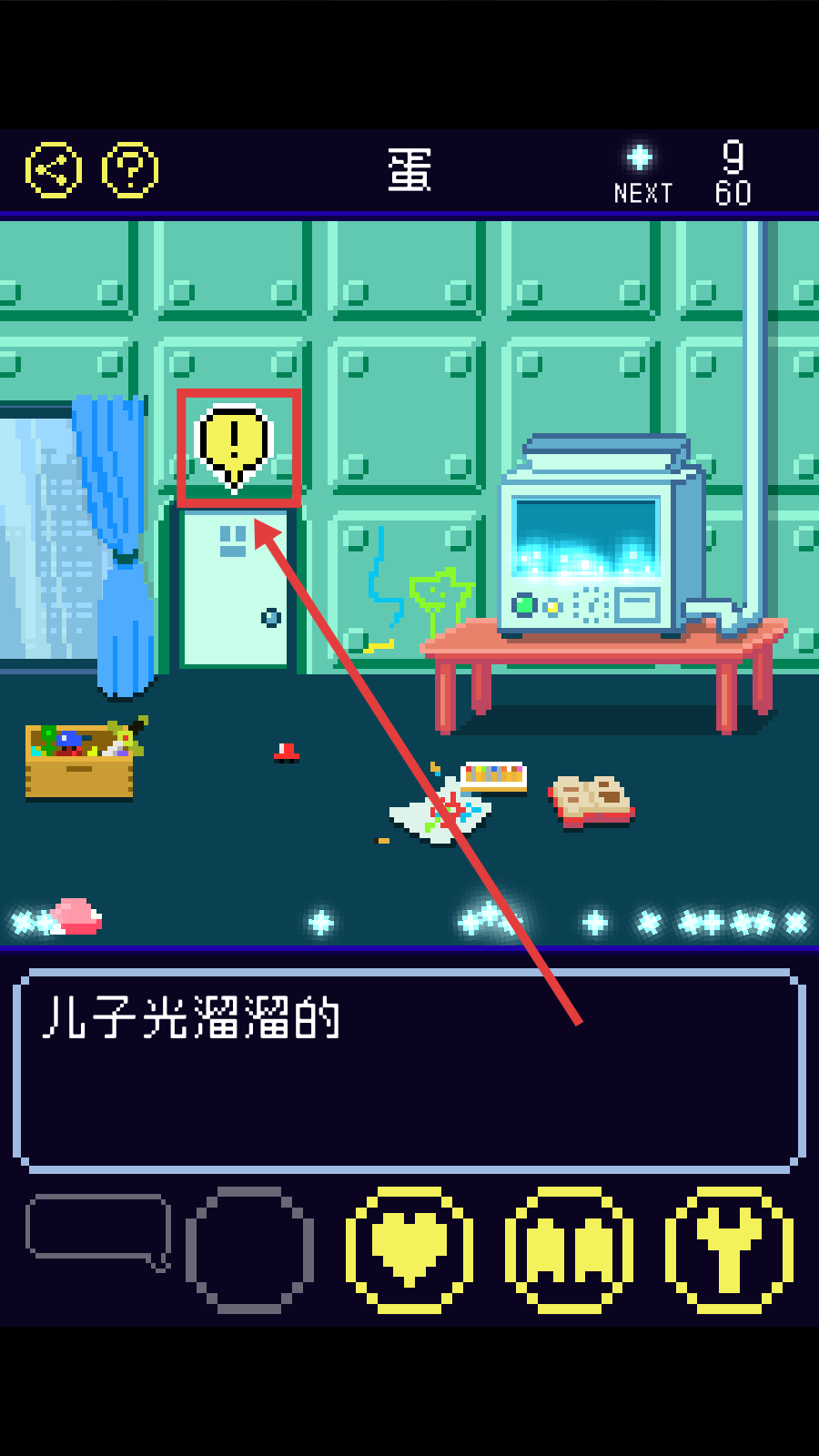 3、游戏中关注带有感叹号标识的区域,像门附近的标识,点击探索可能触发新事件或获取提示,了解“儿子”状态变化,如【儿子光溜溜的】。