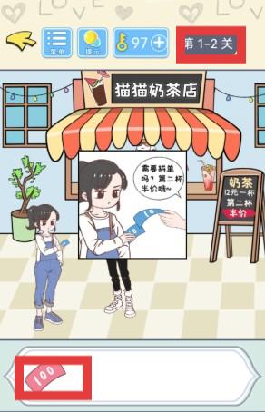 1、在关卡【第1-2关】,观察场景中【猫猫奶茶店】的促销信息【第二杯半价】,寻找男生可以一起买奶茶,成功通关。
