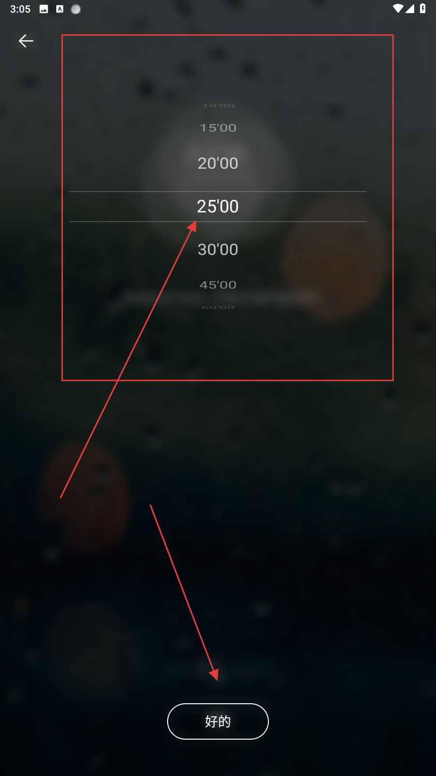 3、在倒计时设置界面,滑动选择倒计时时长如【25'00】,点击【好的】确认设置。