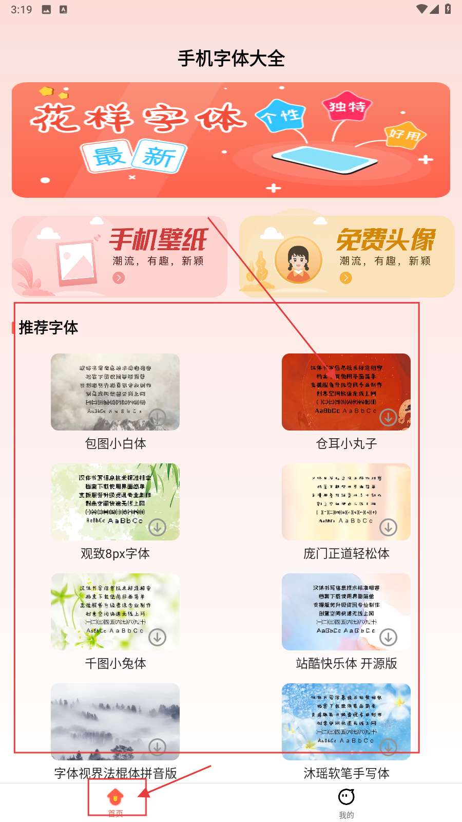 1、打开应用,点击首页【推荐字体】中的【仓耳小丸子】字体。