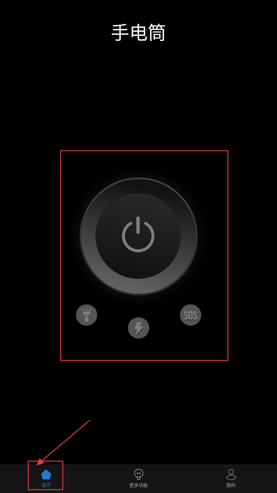 1、打开手电筒应用,点击底部【首页】按钮,进入手电筒主界面。点击中间电源键开启或关闭手电筒,也可按需选择下方【SOS】等功能键。