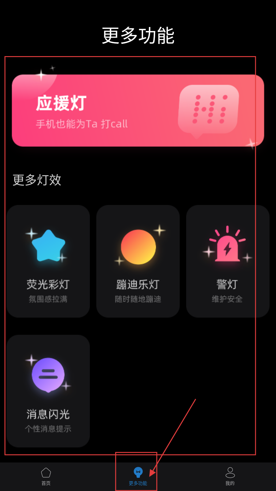2、点击底部【更多功能】按钮,进入更多功能界面,选择【应援灯】等功能,或点击【荧光彩灯】等更多灯效进行设置。