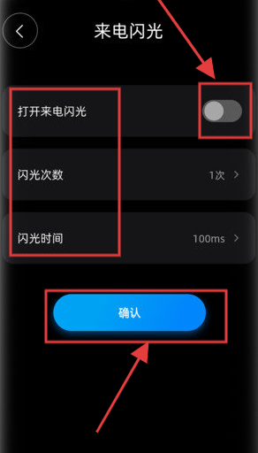 3、以来电闪光设置为例,点击【打开来电闪光】开关,设置【闪光次数】和【闪光时间】,点击【确认】保存设置。