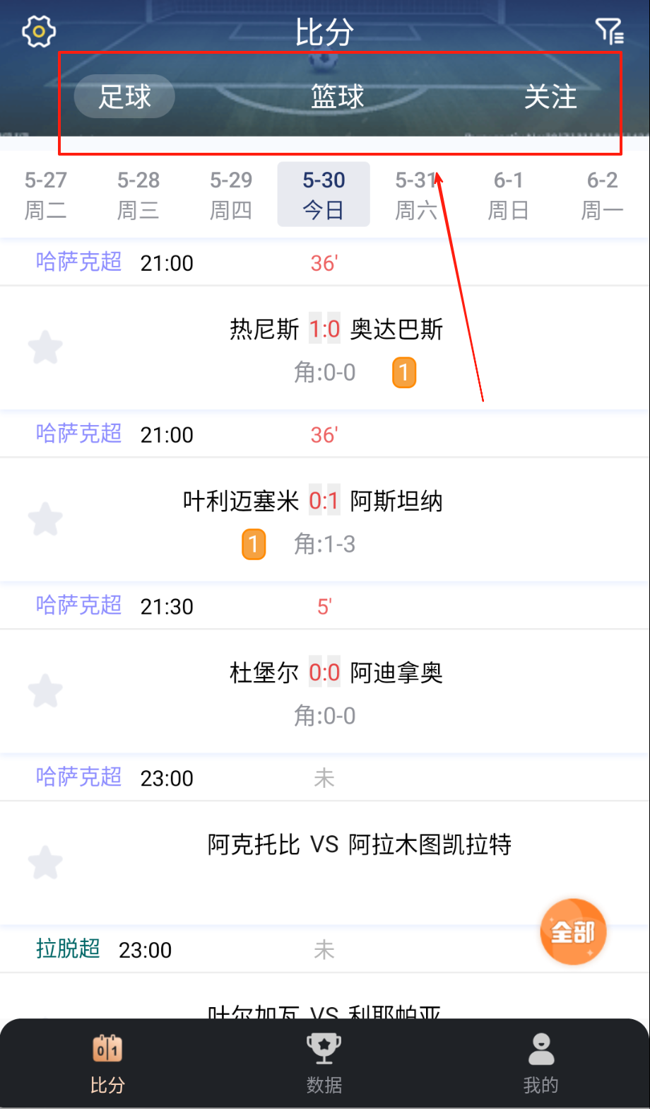 1、 首页浏览智能推荐的焦点赛事,或者通过联赛分类标签,筛选特定比赛场次。