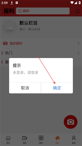 2、在报料页面,点击页面中的相机图标,触发登录提示弹窗。