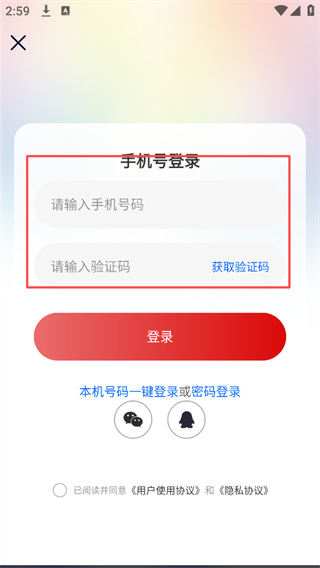4、在手机号登录页面,输入手机号码、获取并填写验证码,点击【登录】按钮完成登录,即可使用报料功能。