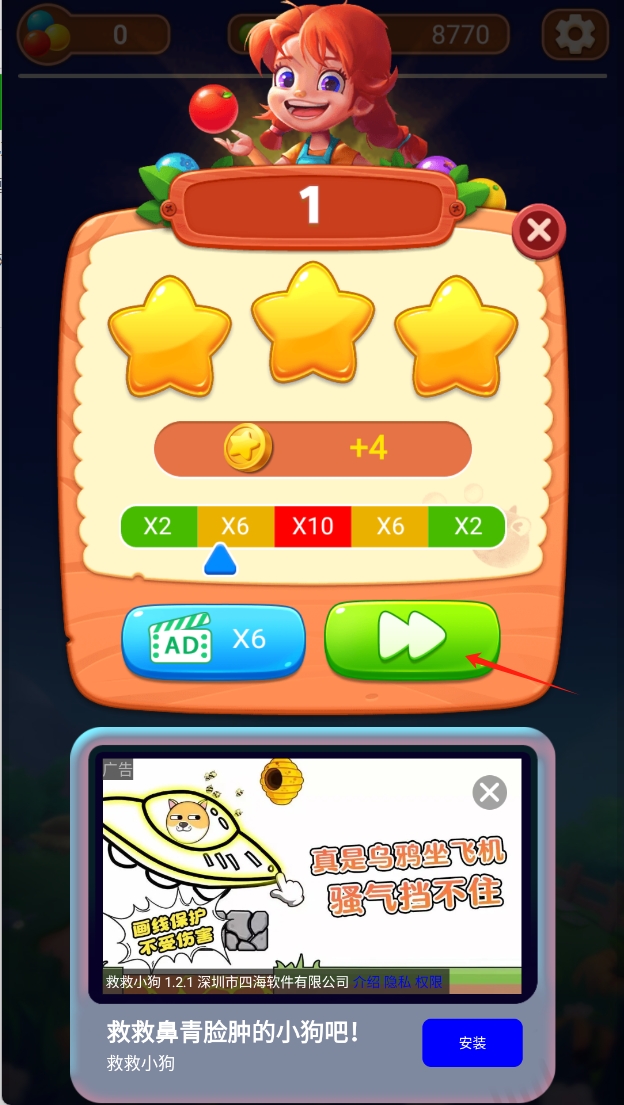 3、完成关卡后,点击“跳过”按钮,跳过广告。获取奖励,继续下一关的挑战,提升游戏技能。