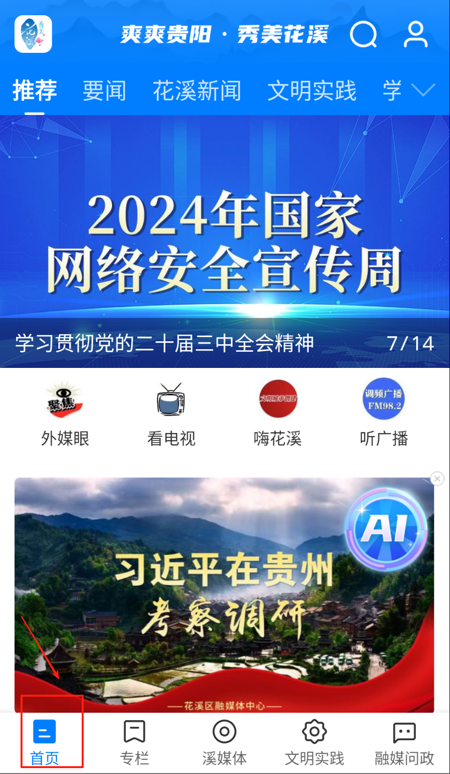 1、完成安装首次启动后,首页自动推送"今日花溪"热点新闻,点击任意卡片可查看图文详情及视频报道,支持滑动加载最新20条本地动态。