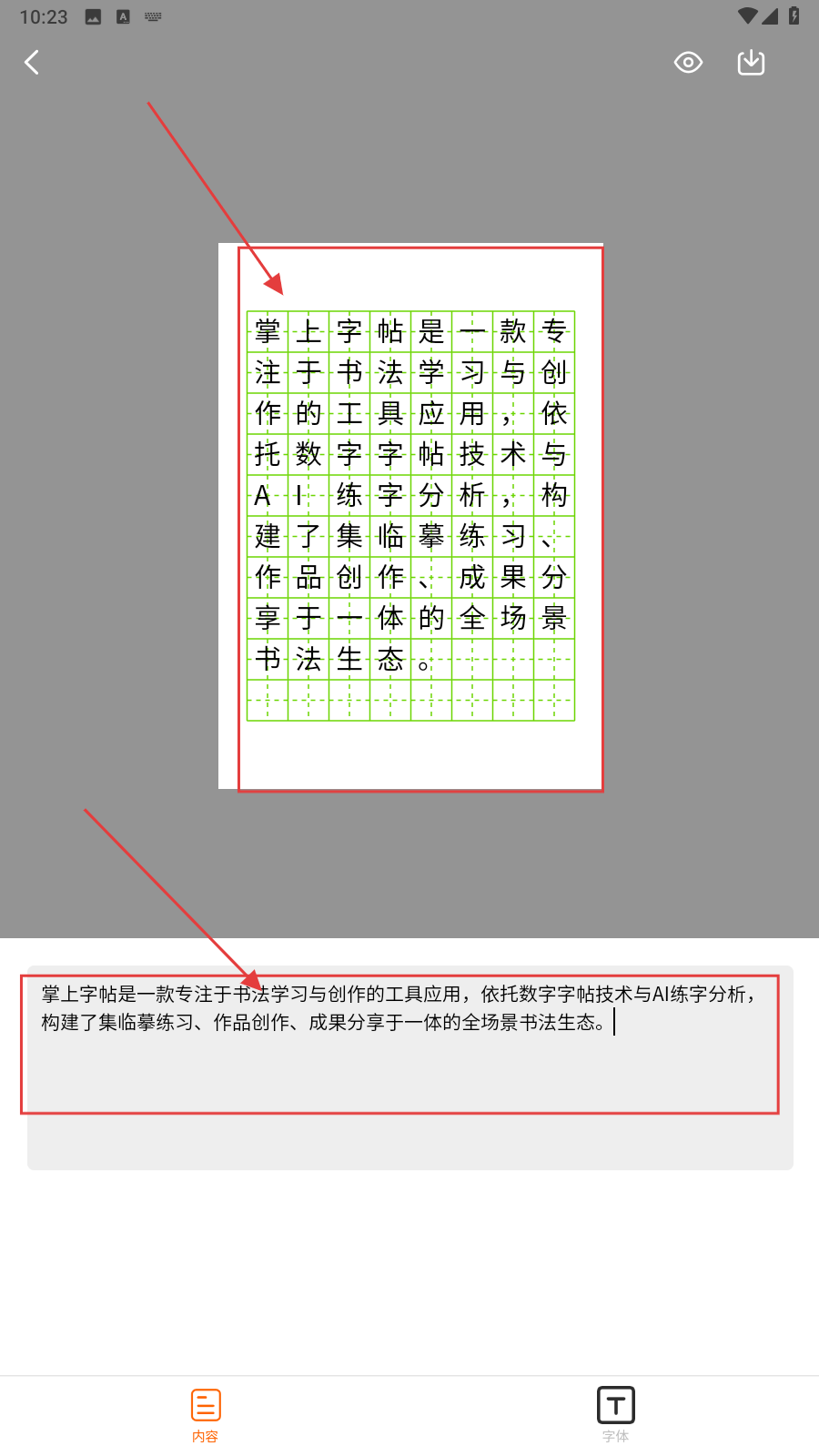 3、输入完成后,可按需调整字体等设置,生成个性化字帖,查看文字在字帖格子中的排版展示效果。
