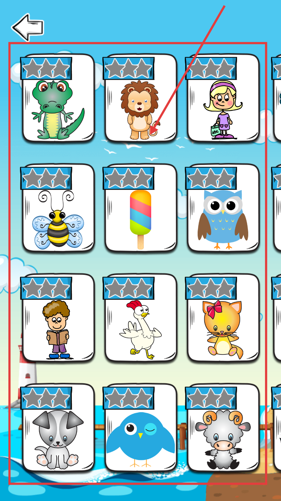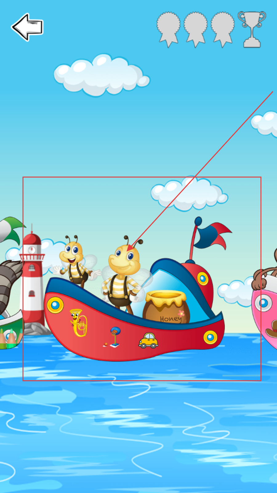 1、打开儿童教育应用,进入主界面,看到各种卡通图案,选择如蜜蜂乘船等感兴趣的场景图案。