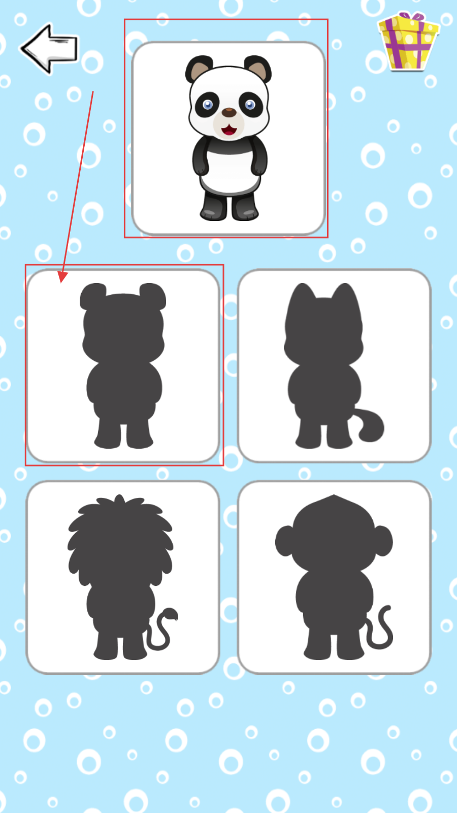 3、点击感兴趣的动物图标进入该动物学习页面,上方展示动物形象,下方有相关互动选项,通过观察动物特征,将其与对应的影子匹配即可。
