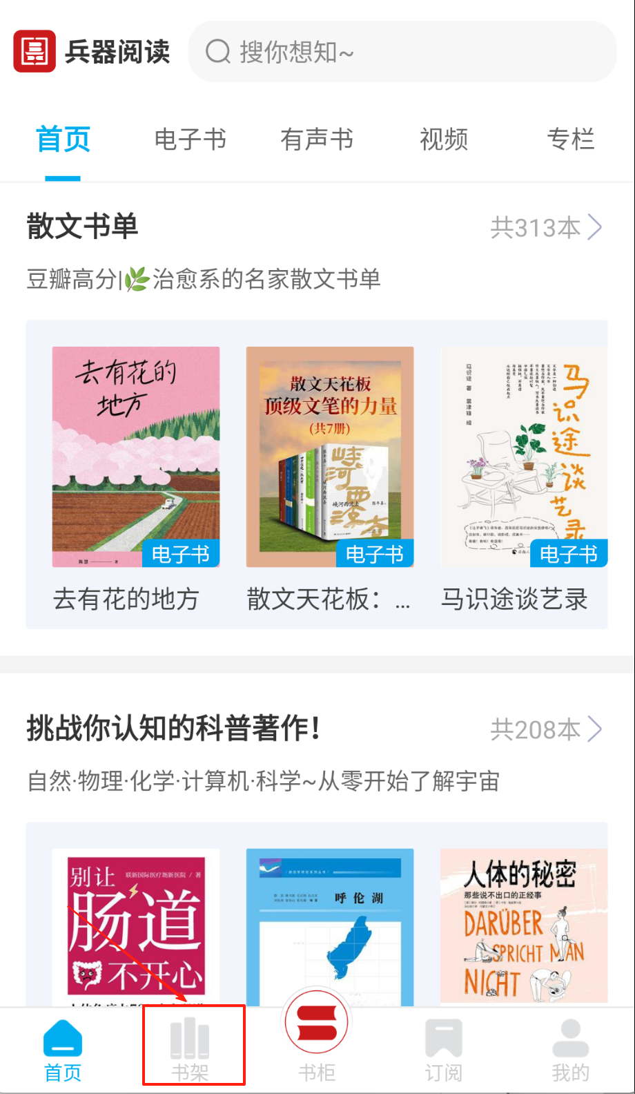 2、利用订阅专区添加个人偏好资源,书架模块管理已下载电子书和音频文件,打造专属阅读空间。