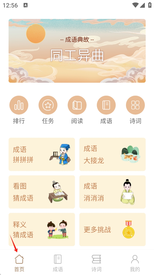 1、进入首页,点击底部导航栏的“首页”图标,浏览推荐的成语学习内容。