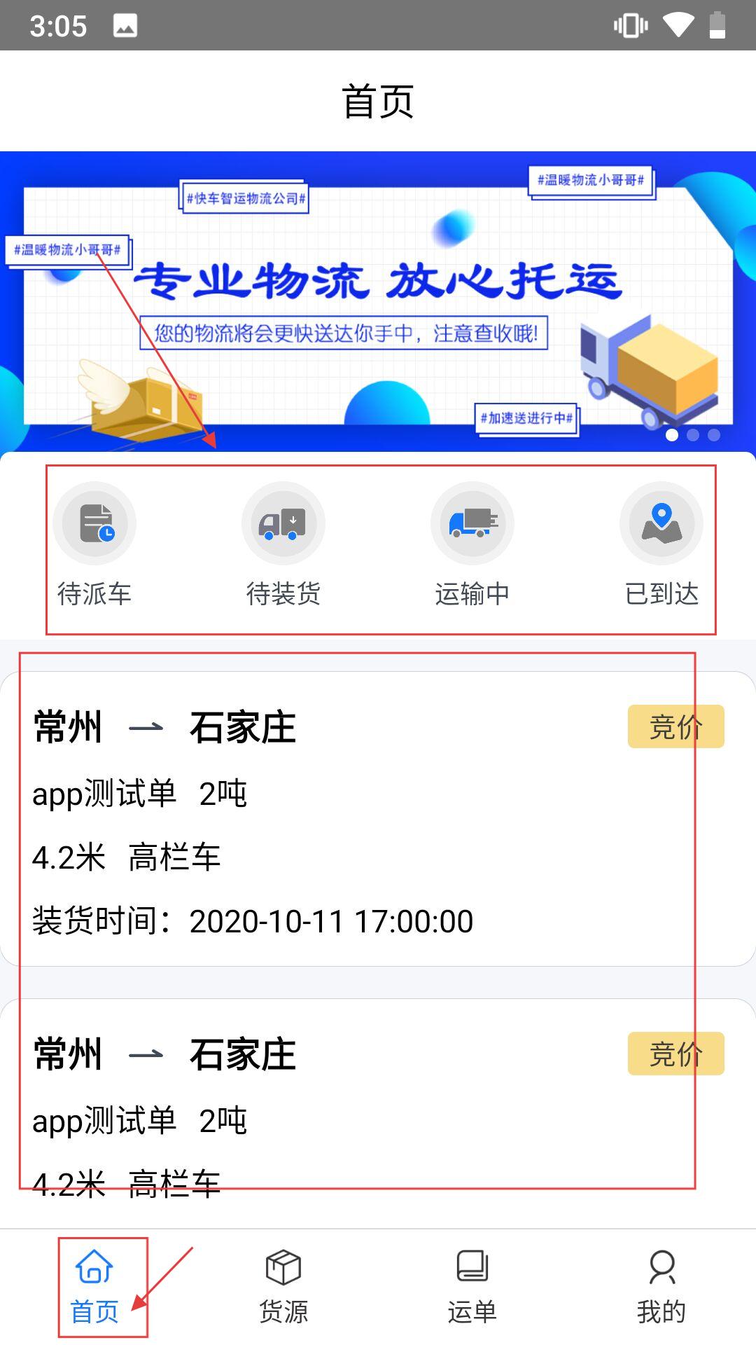 1、打开物流运输类应用,在【首页】可查看【待派车】【待装货】等物流状态,也能浏览货运订单信息,如【常州→石家庄】的订单。