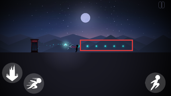 1、熟悉操作按钮,左下角的两个按钮分别用于跳跃和冲刺,右下角按钮控制角色移动,灵活运用这些操作躲避障碍和收集光点。