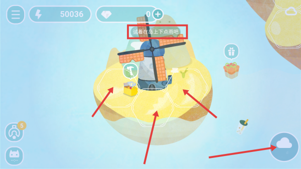 1、初次进入游戏,看到“试着在岛上下点雨吧”提示,点击右下角云朵图标进行操作,探索降雨对岛屿的影响,可能会触发新元素或任务。