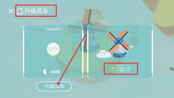 3、关注风车升级,当材料和能量满足条件时,提升风车等级,获取每分钟更多能量及每次点击额外能量,为后续游戏发展积累资源。