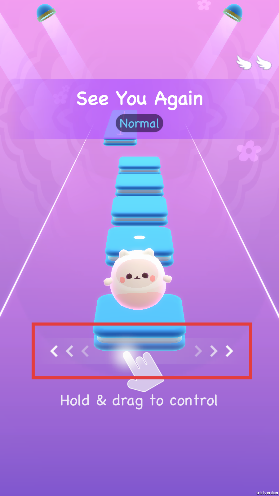 1、游戏开始时,按照提示“Hold&dragtocontrol”,长按并拖动屏幕来操控可爱角色在平台上移动,保持角色在平台上,避免掉落。