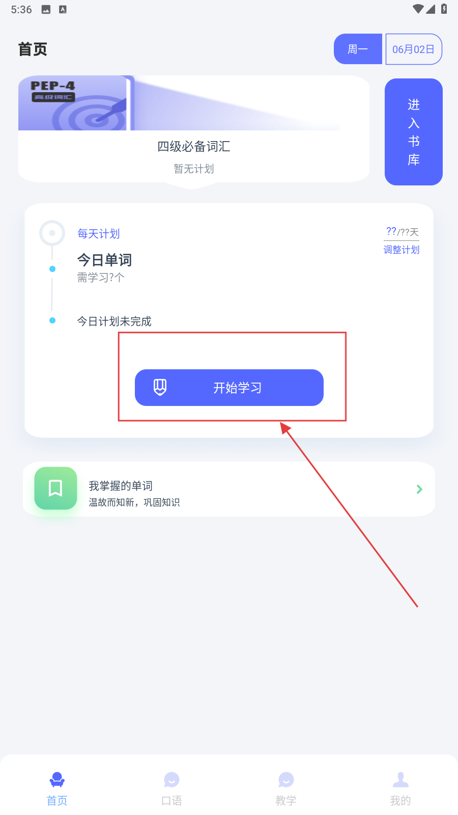 1、打开应用,在首页点击【开始学习】按钮。