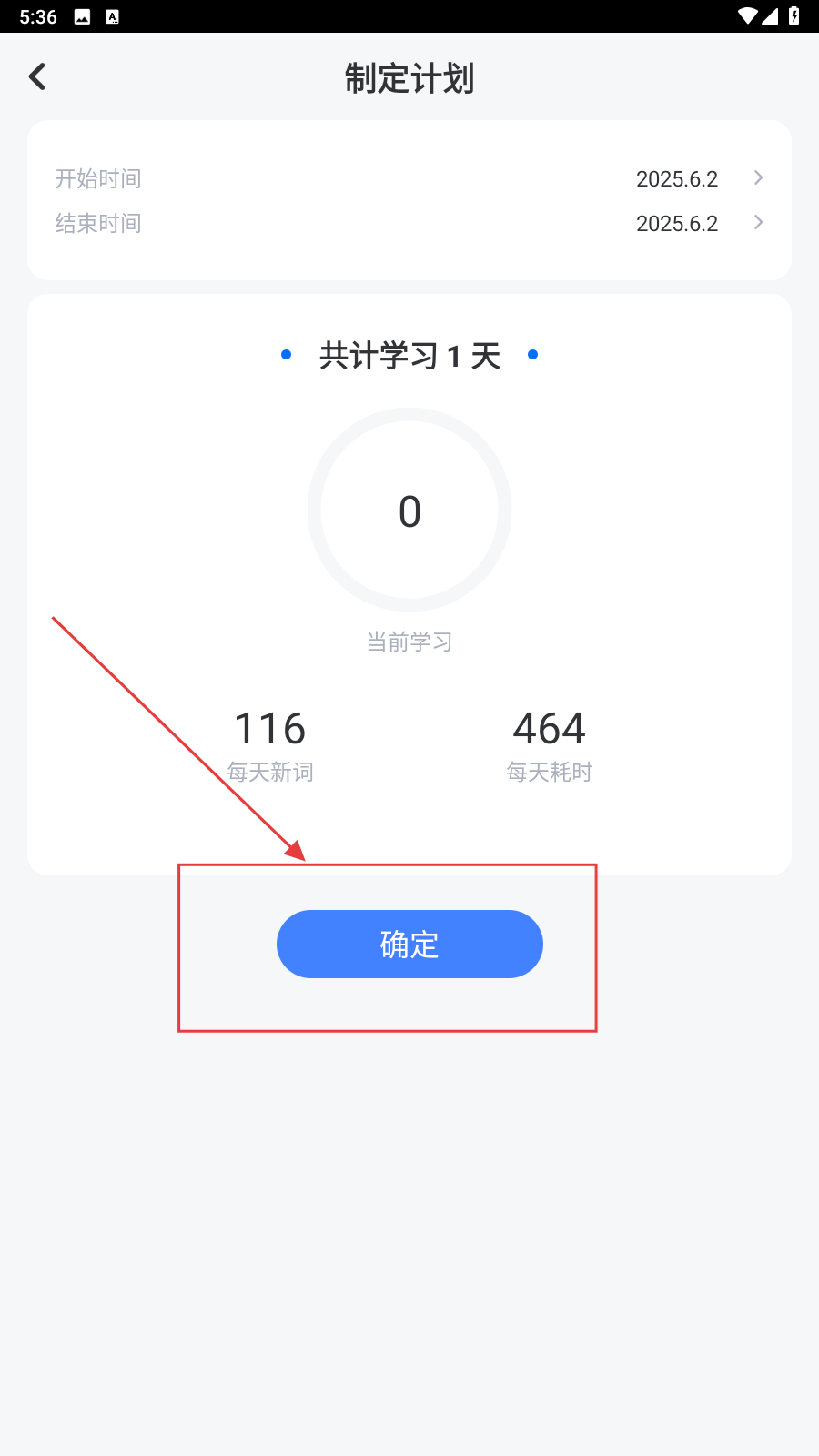 2、进入【制定计划】页面,确认学习的开始和结束时间,设定每天学习新词数量(如116个)和每天耗时(如464分钟),点击【确定】。