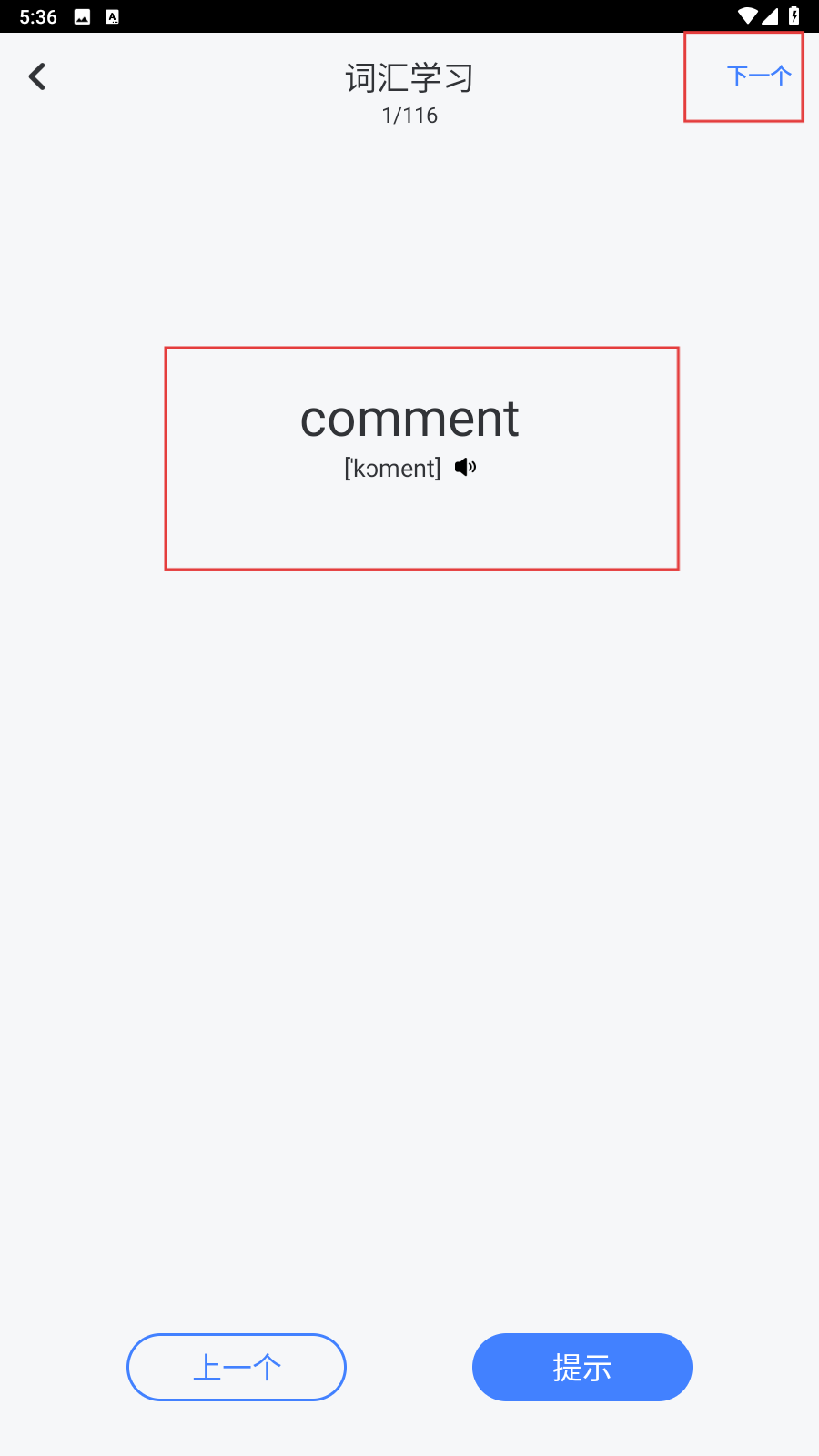 3、进入【词汇学习】界面,开始学习单词,如当前显示单词“comment”,学习完成后,点击右上角【下一个】继续学习下一个单词。
