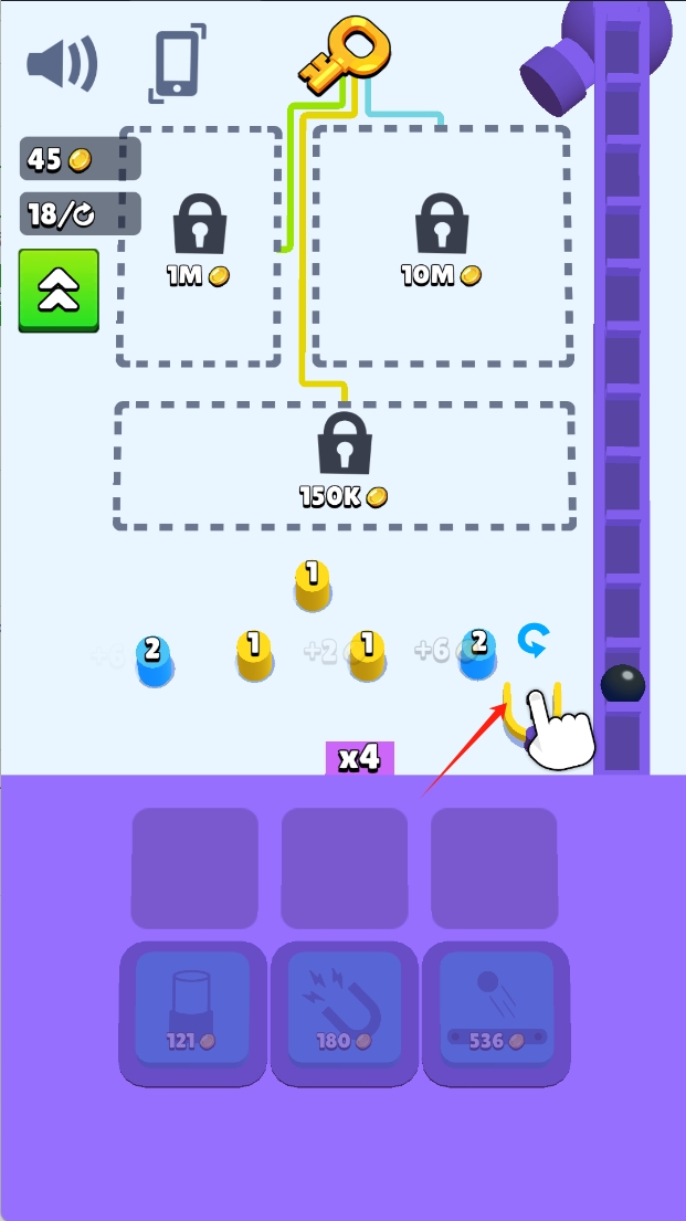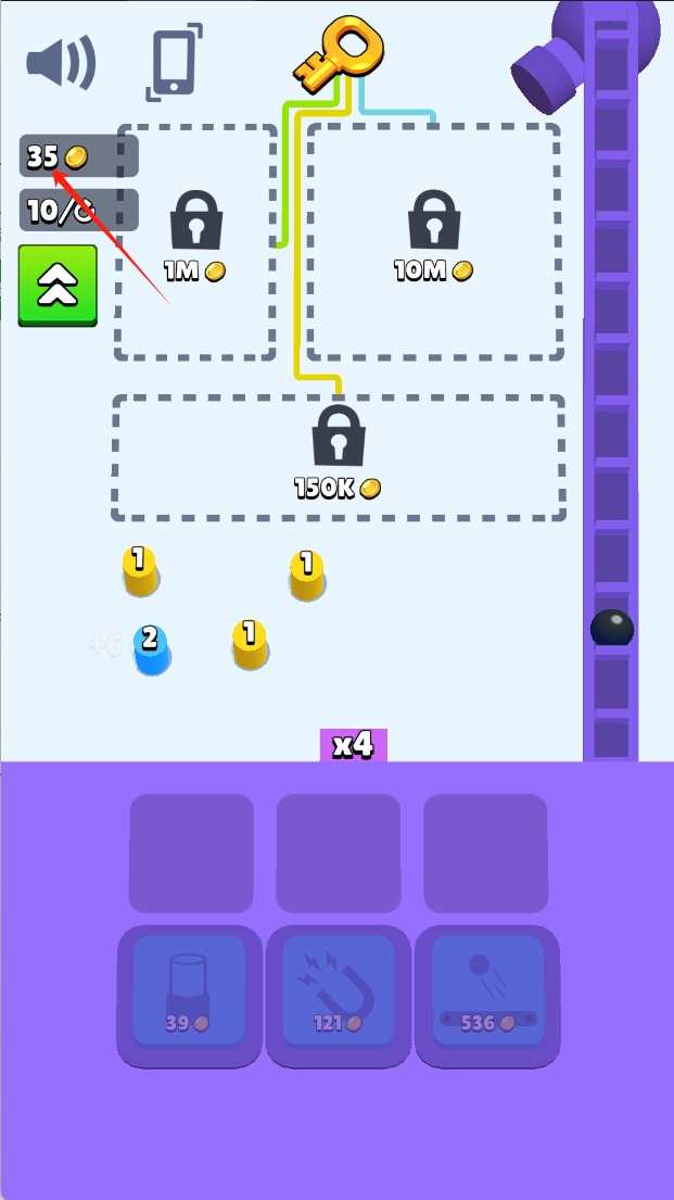 2、合成系统是关键,将两个相同数字的弹球合并,生成更高价值的弹球。数字越大收益越高。