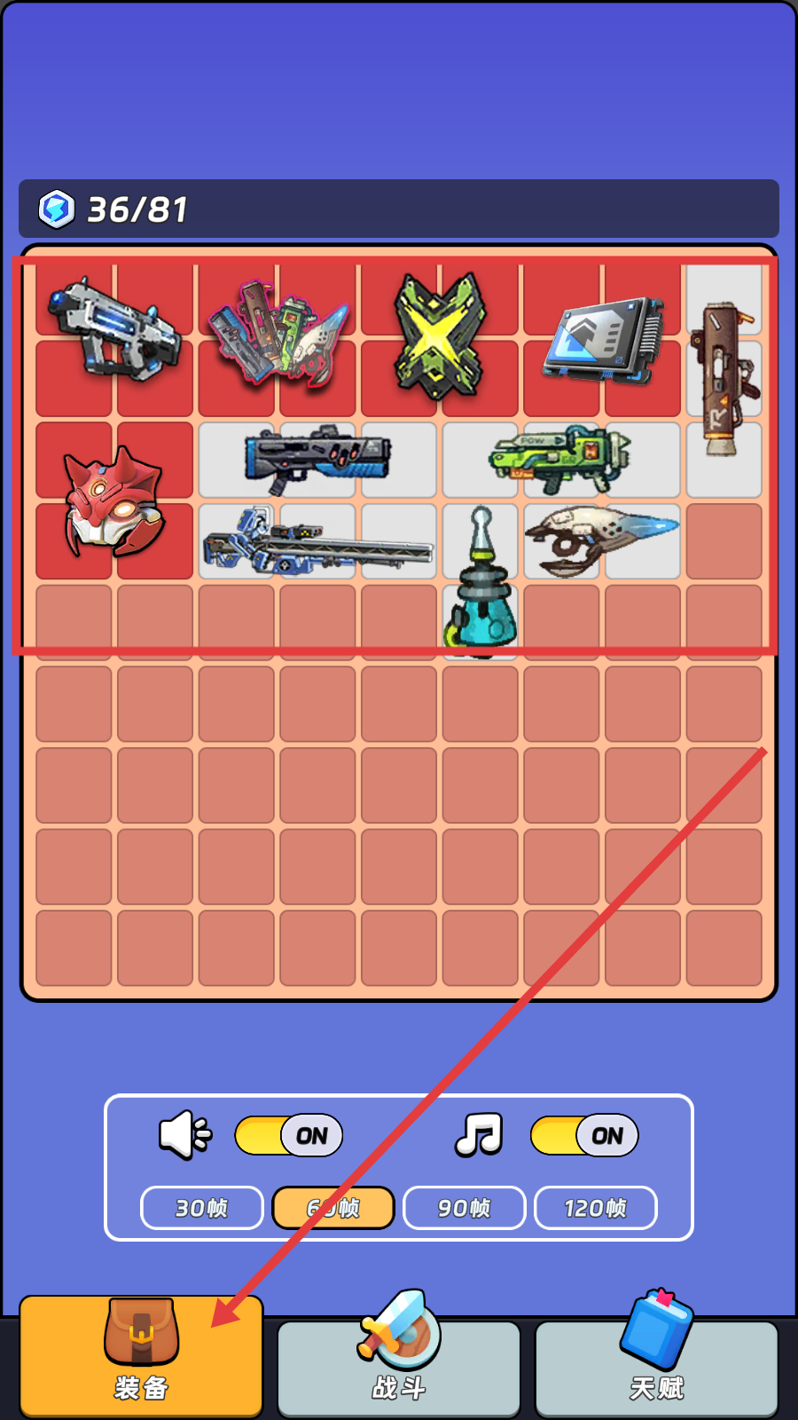 1、在【装备】界面合理搭配武器装备,优先选高伤害、高射速武器提升战力。