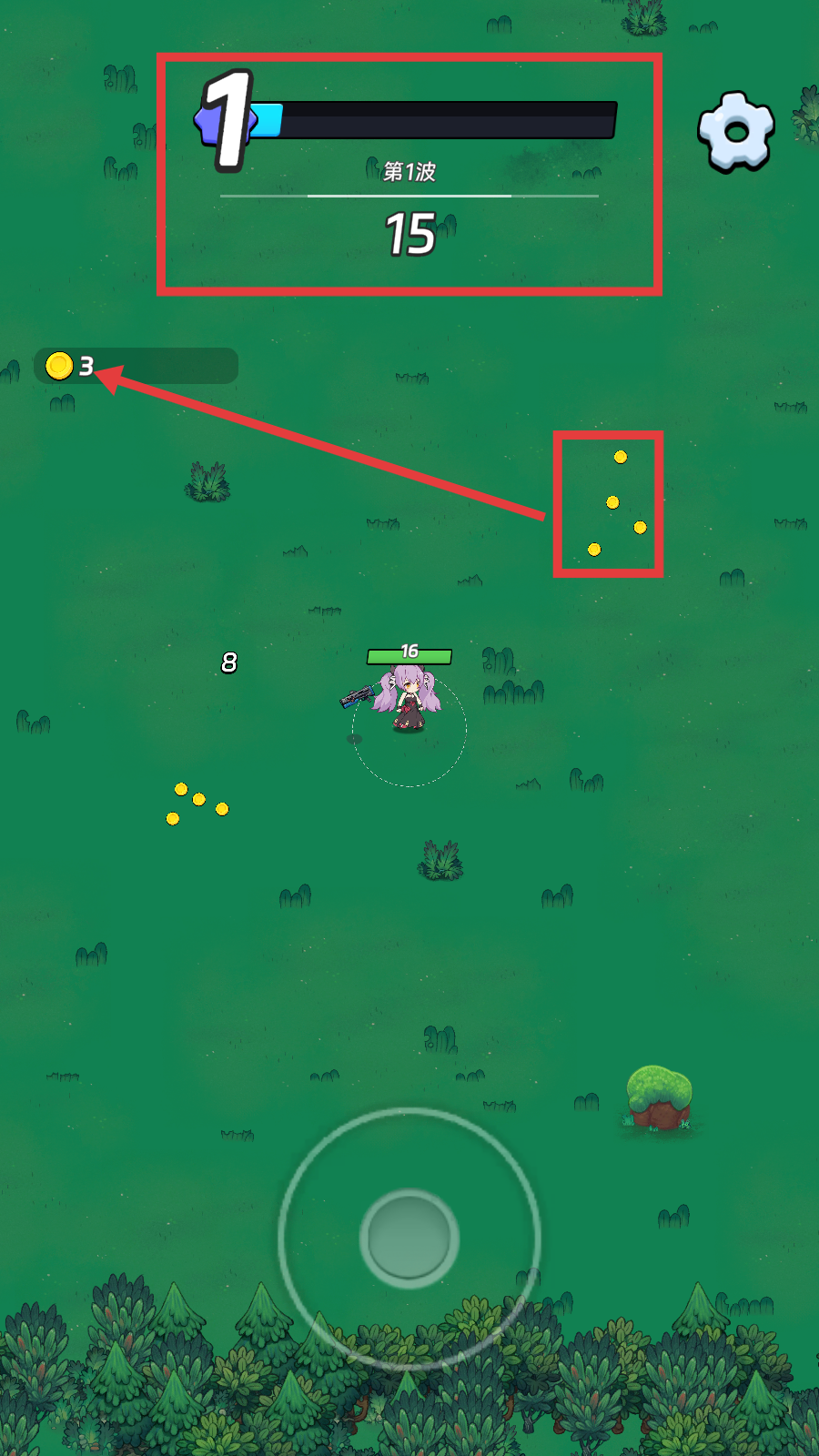 3、注意上方波数进度条,击败怪物收集【金币】,用于后续强化角色与购买道具。
