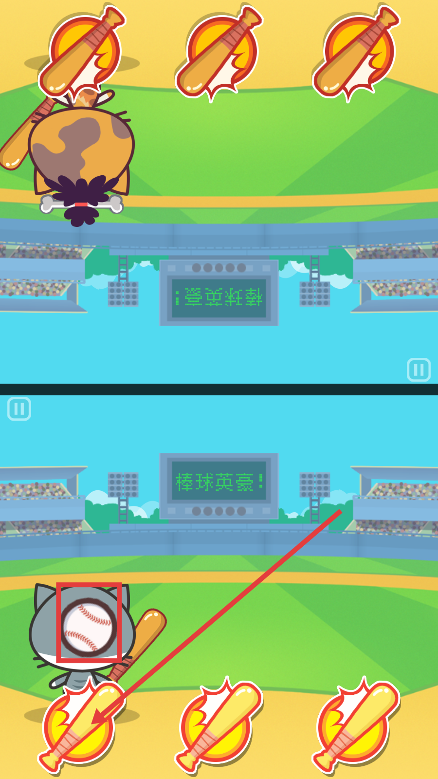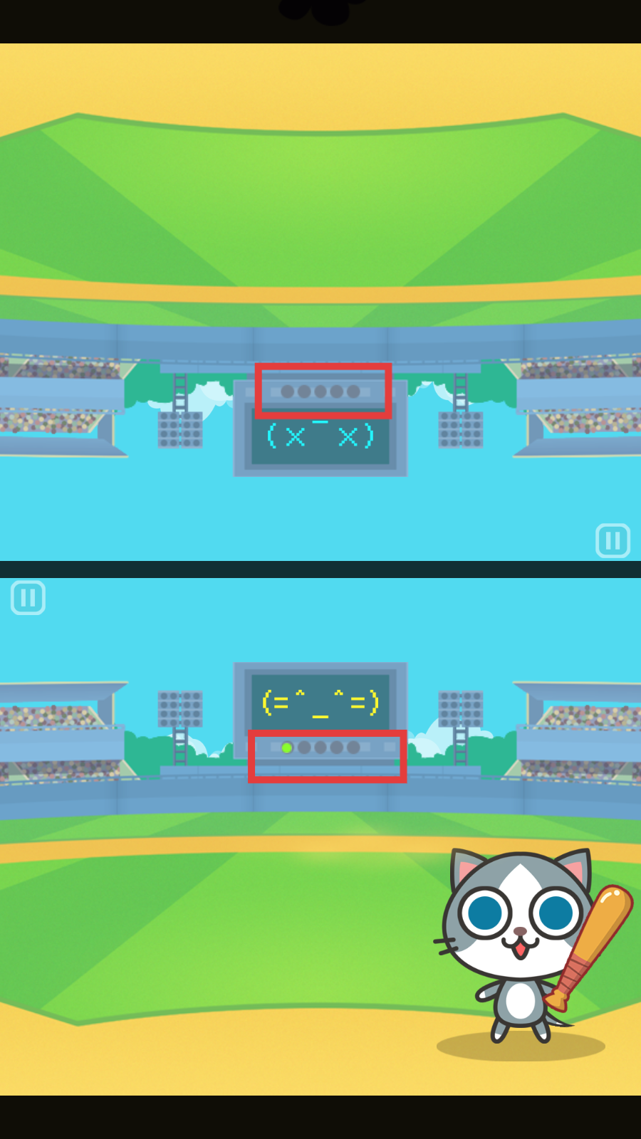2、注意观察猫咪头顶的棒球,当棒球出现时,迅速选择对应的击球按钮,提高击球准确率。