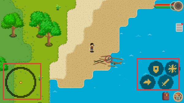 1、初到荒岛,留意屏幕右侧操作按钮,利用移动、攻击等按钮探索荒岛,如靠近图中圆圈标记区域。