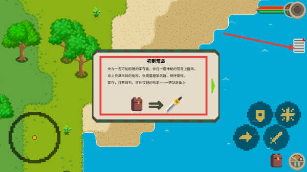 2、按照【初到荒岛】提示,点击屏幕右侧纸张图标打开任务提示,再打开背包装备【剑】以应对危险。